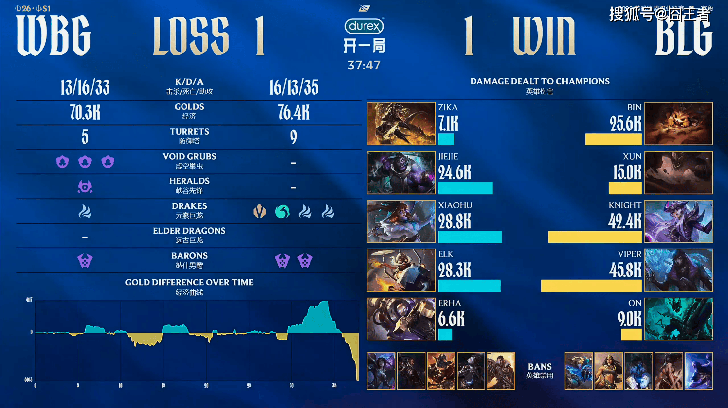 结果第二局比赛,两队打得是十分激烈,经济几经反转,最终由BLG拿下胜利。15分钟左右,Viper厄斐琉斯激进站位被秒,WBG团战取胜拿下先锋;17分钟左右,Xun石头人大招撞起两人,BLG众人强行越塔击杀Elk与Erha;20分钟左右,BLG抓住机会迅速拿下大龙,WBG持续追击完成0换2;23分钟左右,WBG众人强行集火击杀Viper,但BLG完成1换2并拿下听牌龙;27分钟左右,Zika鳄鱼大绕后直接被秒,BLG团战取胜拿下风龙魂;29分钟左右,Jiejie化身驯龙高手抢下大龙,WBG团战取胜延续悬念;32分钟左右,WBG拿下大龙后下路持续推进,击杀Xun后WBG经济取得领先;35分钟左右,Xiaohu阿萝拉开团直接被秒,BLG团战取胜拿下远古龙;最终37分47秒,BLG团灭WBG,扳回一局!